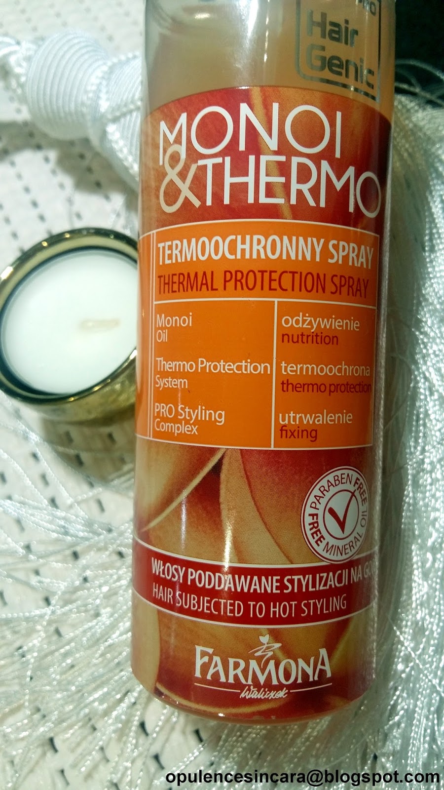 Farmona Monoi&Thermo - do każdego rodzaju włosów narażonych na działanie wysokiej temperatury podczas suszenia i stylizacji na gorąco. Unikalna formuła ma łączyć w sobie odżywcze właściwości olejku Monoi ze specjalnie opracowanym systemem Thermo Protection. Ma tworzyć na włosach cienki film zabezpieczający je przed zniszczeniem spowodowanym używaniem suszarki, prostownicy lub lokówki. Kompleks PRO Styling ma ułatwiać i utrwalać stylizację, zapobiegać puszeniu i elektryzowaniu. Ultralekka konsystencja sprayu ma nie obciążać i nie sklejać włosów.